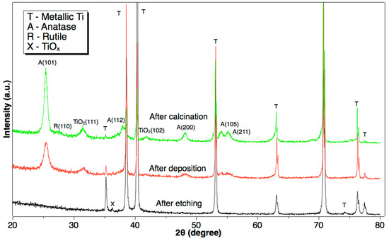 The influences on X-ray diffraction (XRD) of each step for the preparation of the TiO2 nanowire arrays are presented in Figure 3. As shown, there are only characteristic diffraction peaks of metallic Ti after the etching step; however, a less obvious peak can be observed at 36.2°, which corresponds to TiOx of the Joint Committee on Powder Diffraction Standards (JCPDS) card 43-1295. This probably means that, in the process of etching, the surface of the Ti plate was, not only cleaned in the acidic solution (removing impurities), but also was preliminarily oxidized by the F−-containing solution. In the process of deposition, according to the XRD pattern, anatase TiO2 (JSPCS card 21-1272) already formed, but with a subcrystalline structure, and the peak of TiOx (110) disappeared. After annealing at 500 °C for 2 h, the characteristic diffraction peaks of the anatase phase became much sharper; a peak of the rutile phase (110) at 27.5° even appeared. In addition, two small peaks at 31.5° and 42.0°, along with the anatase formed in the deposition step, and crystalized completely in the calcination step, which belongs to the phase (111), (102) of the other kind of TiO2 (JCPDS card 21-1236), respectively, without photocatalytic activity [25].