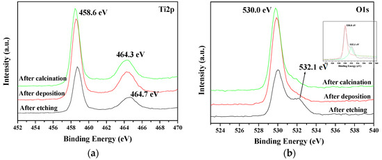Figure 4 shows the X-ray photoelectron spectroscopy (XPS) of TiO2 nanowire arrays under different preparation stages, which helps in the investigation of the valence states and chemical composition of the sample. As shown, two peaks can be observed, which belong to Ti 2p1/2(~464.3 eV) and Ti 2p2/3(458.6 eV), respectively. The binding energy of Ti2p shifted slightly after every preparation stage, meaning that Ti-ion was formed on the surface of the Ti plate during the etching process. On the other hand, two peaks (i.e., 530.0 eV and 532.1 eV) emerged in the XPS spectra of O1s after etching the Ti plate, while the peak at 532.1 eV disappeared after the deposition. According to Hiromoto et al. [26], these two kinds of O peaks came from TiO2 (530.0 eV) and Ti-OH (532.1 eV), respectively. The result indicated that the Ti plate was fluorided and was preliminarily oxidized during the etching process, which promoted further oxidation to produce the TiO2 nanowire arrays.