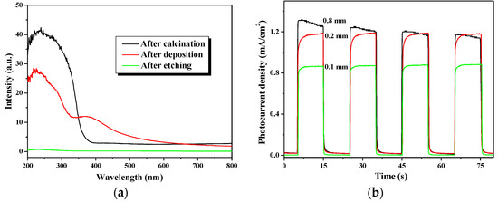 (a) Diffuse reflection spectrum of TiO2 nanowire arrays; (b) photocurrent of TiO2 nanowire arrays deposited on the Ti plate with different thicknesses.