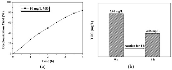 Photocatalytic activity test for methyl orange (MO). Reaction conditions: 45 mL of 10 mg/L MO as degradation target, 7 W ultraviolet (UV) lamp as light source, TiO2 nanowire photocatalyst deposited on 0.2-mm substrate with 20 mm × 20 mm active area immersed in the pollutant solution; the distance between light source and catalytic film is 20 mm. The reaction was conducted in a quartz beaker under magnetic stirring. (a) The line curve is decolorization yield changes with time; (b) the bars diagram represents the initial and final total organic carbon (TOC) value after the 4-h reaction.