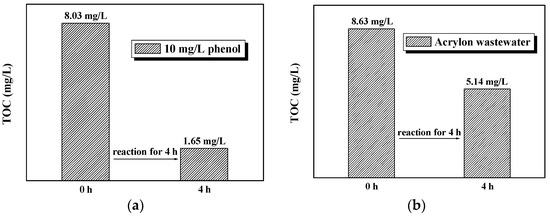 Two further experiments were conducted using 10 mg/L phenol and diluted acrylon wastewater as the pollutant for degradation. Figure 7a shows that, after 4 h of the TiO2-based photocatalytic degradation reaction, the TOC value of the phenol solution sharply decreased from its initial concentration of 8.03 gm/L to a final concentration of 1.65 gm/L; the mineralization yield of the 10 mg/L phenol can reach as high as 79%, which is much better than the methyl orange degradation, as mentioned above. However, when acrylon wastewater was used as the degradation target under the same experimental conditions, the mineralization yield was less than 50% (Figure 7b). As is known, phenol is normally hard to decompose due to its stable benzene ring structure; the results may illustrate that the TiO2 nanowire prepared using this method can be more effective in decomposing phenol than acrylon wastewater.