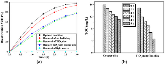 The influences of PRD-reactor parameters on reaction efficiency were studied using 15 mg/L MO as our degradation target. As shown in Figure 8a, under the optimal reaction conditions (black curve), the decolorization yield of MO almost reached 98% under UV lamp irradiation for 3 h with air bubbling being employed to enhance mixing and improve dissolved oxygen content. This result is used as a reference for evaluating the effects of each individual factor. First, the TiO2 disc was removed and air bubbling was maintained to understand the effect of the photolysis process on the degradation yield; the result (green curve) shows that the decolorization yield drops, but can still reach 79%, even without the TiO2 disc for photocatalytic reaction, which is attributed to the strong oxidization of UV photolysis. Air bubbling also increases the dissolved oxygen content in the solution, promoting the photolysis process. Subsequently, experiments with air bubbling removed and replacing the TiO2 disc with a copper (very stable under UV irradiation) disc, with and without disc rotation, were carried out to compare the effect of disc rotation, with and without air bubbling. In this case, the decolorization yield (blue curve) indicated that the disc rotation was advantageous, which can replace air bubbling and, hence, reduce costs; in addition, it can also benefit the photocatalytic reaction. Subsequently, air bubbling was removed from the optimal condition to further verify the influence of air bubbling (red curve), which slightly dropped the decolorization yield (93.9%) compared with the optimal case. Finally, the cyan curve obviously indicates that UV irradiation alone is the most essential factor in the entire PRD-reaction as the MO decolorization yield is almost 0% under the presence of the TiO2 disc and air bubbling, even including the adsorption of dyes on the surface of the TiO2 disc.