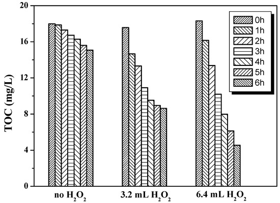 Obviously, further decomposition of wastewater after the biodegradation process reaches a lower concentration (below 20 mg/L of TOC value) is difficult. Figure 9 shows the TOC values of the PRD-reactor treating biodegraded wastewater. As shown, the degradation effect of the pure PRD-reaction is not satisfactory for biodegraded wastewater, probably due to its rigid molecular structure. Therefore, in order to get a better reaction efficiency, a small dose of H2O2 (3.2~6.4 mL H2O2 in 5 L wastewater) was added as an enhanced oxidant in the reaction. The results show that the reaction activity can be greatly enhanced after the addition of H2O2. The TOC removal rate increased from 16.2% to 52% and 75.2% for 3.2 mL and 6.4 mL H2O2, respectively. More intensive research has been conducted to study the function of H2O2 in the advanced oxidation process. Here, the H2O2 was used as an electron acceptor in the photocatalytic reaction due to its higher activity than oxygen, in order to capture the photogenerated electrons to produce active OH• radicals, which can target pollutant molecules for an efficient degradation. Additionally, H2O2 reacted with photogenerated electrons could reduce the recombination of photogenerated electron-hole pairs, which could directly contribute to the degradation reaction.
