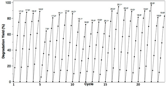 Figure 10 shows the results of degradation using the TiO2 disc with a TiO2 nanowire film and was tested with 20 mg/L phenol in a consecutive cycle. As can be seen, after 23 cycles, the TiO2 nanowire film deposited on the Ti plate still maintained a good activity (>80%). The only influencing factor was temperature. The degradation yields could be similar under similar temperatures, and a higher temperature results in a higher yield. This shows that the degradation yield was affected by the temperature of the operation. As a whole, the result demonstrates a good repeatability for each cycle.