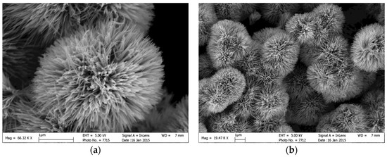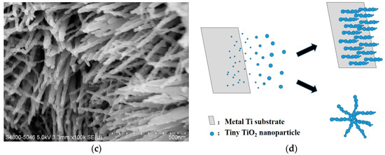 Figure 11 shows the deposition process of the TiO2 nanostructure and the corresponding SEM diagrams at different magnifications. The deposition process of TiO2 nanowire arrays follow the steps listed below. First, metallic Ti was preliminarily oxidized to a Ti-ion state in the etching step, which triggered further oxidation in an acidic H2O2 solution to form TiO2 nanoparticles. In the deposition process, Ti-ion was dissolved in H2O2, then quickly oxidized to TiO2 and grown into tiny nanoparticles. According to the HR-TEM (Figure 1b) and SEM (Figure 11c) images, most of the tiny nanoparticles were deposited on the nearest metal Ti substrate to fabricate nanowire with a nanoflower structure under the appropriate H+ concentration, while the rest of the nanoparticles could not be immediately loaded, so they agglomerated with the growing point as the center to form a nanoflower via numerous nanowires in the solution (as shown in Figure 11a,b).