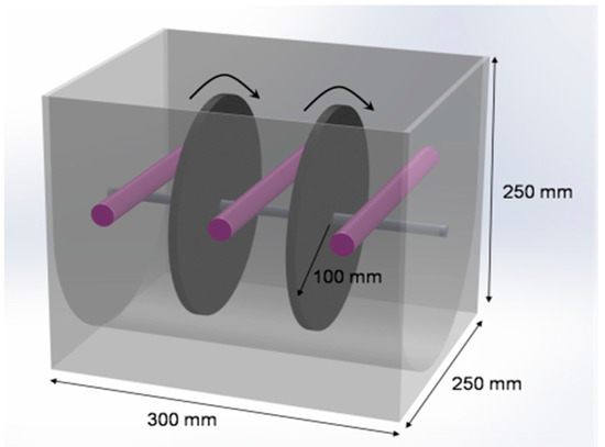 As shown in Figure 12, the reactor is a rectangular tank with a working solution volume of ~5 L during operation. The rotating shaft is set at a height of 1 cm above the water surface. Three UV lamps were fixed on the wall of the reactor, which was positioned over the rotating shaft. The shaft across the reactor is located in the middle of reactor and was connected to an electric motor with a rotating speed that ranged from 1 to 40 rpm. The shaft holds two Ti plates with TiO2 nanowires deposited on its metal Ti surface; the distance between the lamp and the TiO2 photocatalyst was 5 cm. UV light sources with two power settings were used: 7 W for stagnant tests, and 10 W for PRD-reactor experiments. The total photocatalytic active area of the TiO2 was 1248 cm2.