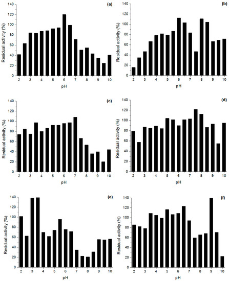 When incubated at different pHs, the derivatives in general presented higher stability in acid-neutral pH and lower activity in more alkaline pH (Figure 1).