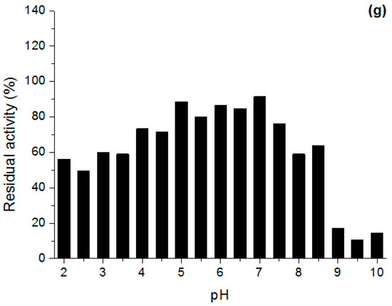 Stability in different pH of the Penicillium sp. (CBMAI 1583) lipase derivatives in aqueous media. (a) Butyl Sepharose; (b) phenyl Sepharose; (c) octyl Sepharose; (d) Toyopearl butyl 650 M; (e) Lewatit VP OC 1600; (f) octadecyl Sepabeads and (g) CNBr derivatives. The derivatives were incubated at 1:10 (w/v) proportion in the following buffers: 0.5 M glycine-HCl pH 2.0 and 2.5; McIlvaine pH 3.0–8.0; 0.5 M Tris-HCl pH 8.5 and 9.0; and 0.5 M glycine-NaOH pH 9.5 and 10.0; for 24 h at 25 °C.