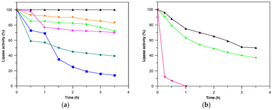 Thermal inactivation of the Penicillium sp. (CBMAI1583) lipase derivatives. Incubation was carried out in 5 mM sodium phosphate buffer pH 7.0 at (a) 50 and (b) 60 °C. Lipase activity (%) of (▲) Toyopearl butyl 650 M; () Lewatit VP OC 1600; () octadecyl Sepabeads; () butyl Sepharose; () phenyl Sepharose; () octyl Sepharose and () CNBr derivatives.
