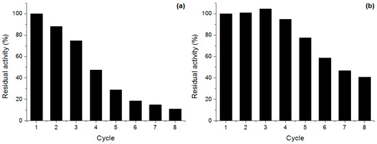 Reuse of (a) octyl and (b) phenyl derivatives of Penicillium sp. (CBMAI 1583) lipase on pNPP hydrolysis. Reactions were carried out in sodium phosphate buffer pH 7.0 at room temperature, as described in Section 3.9.