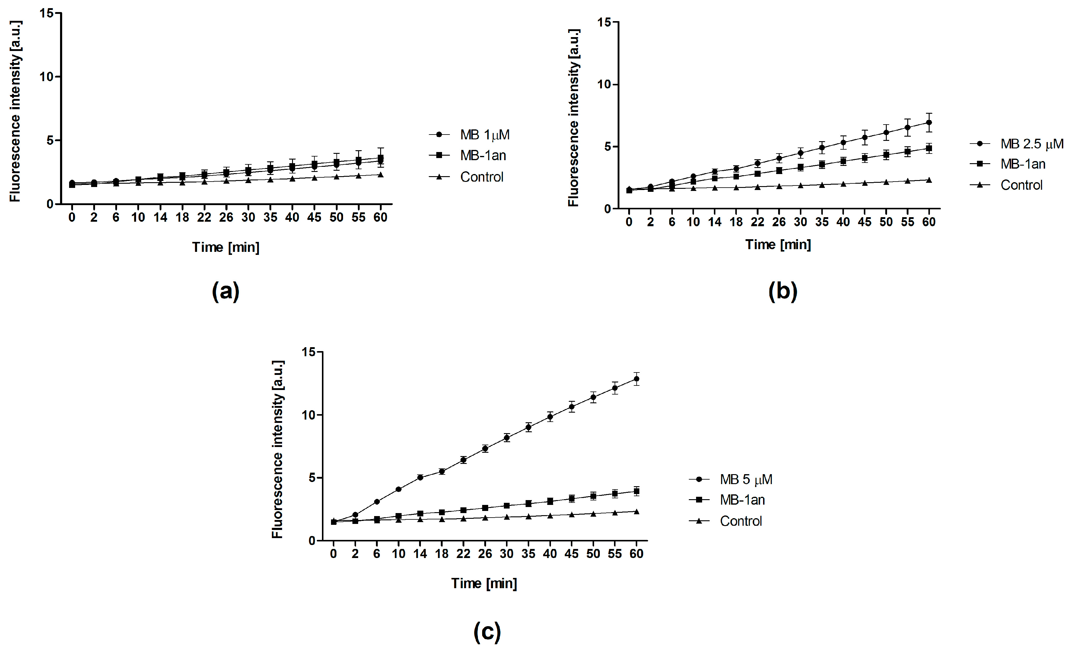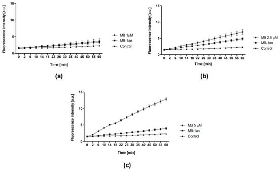 Firstly, we compared singlet oxygen production of free MB and MB-1an in an aqueous medium. We used a highly selective singlet oxygen sensor green (SOSG) probe, which originally exhibits weak blue fluorescence, but in the presence of singlet oxygen SOSG fluorescence intensity increases and shifts to longer wavelengths. As it can be seen in Figure 1, the fluorescence of SOSG increased over the time of irradiation in the presence of MB-1an and MB. For the lower concentration, no significant differences were observed between MB and MB-1an. However, the values of SOSG fluorescence intensity were lower in the presence of MB-1an than in the presence of free MB at concentrations of 2.5 and 5 µM.