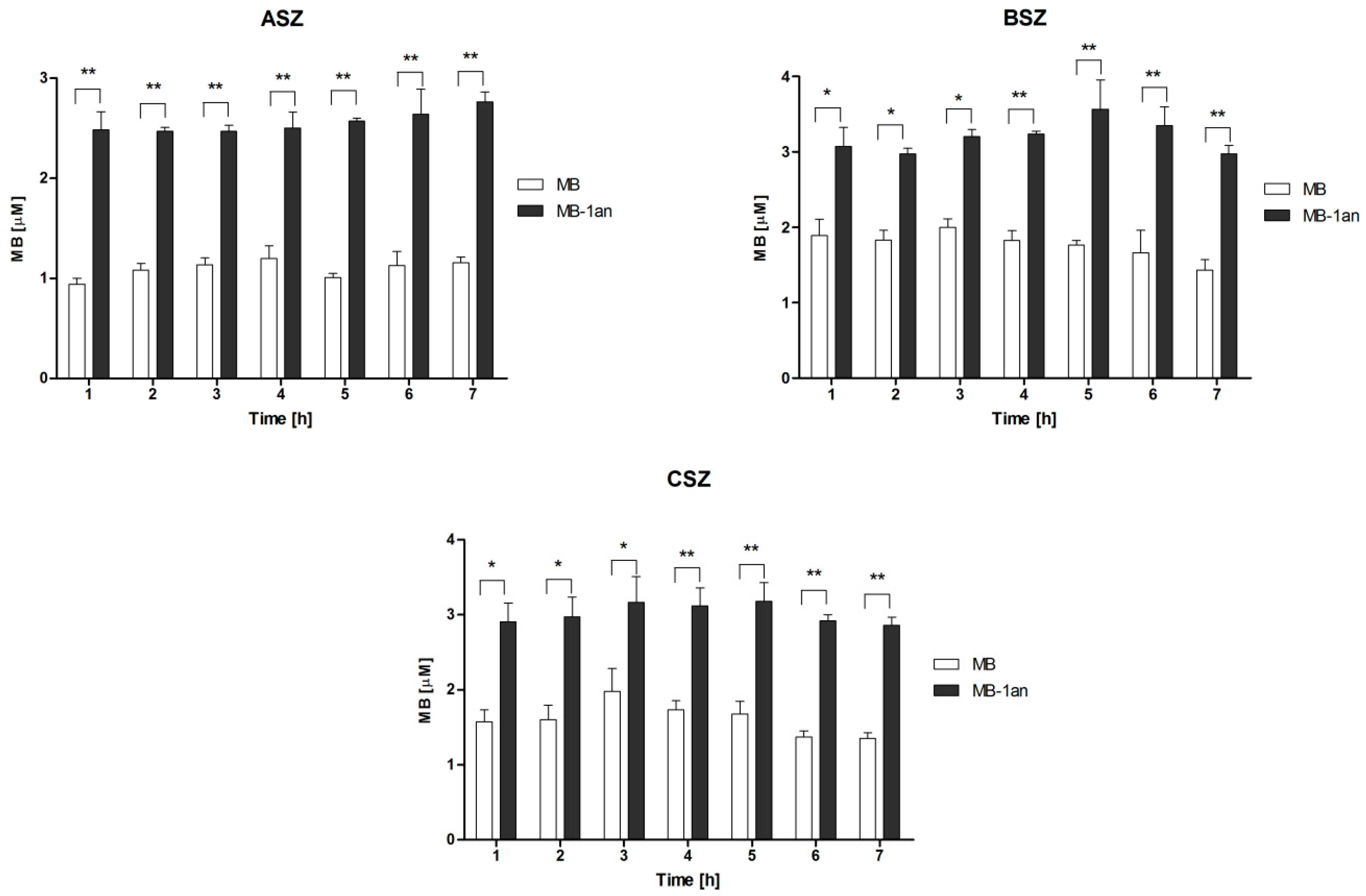 Cellular uptake of MB and MB-1an for ASZ, BSZ, and CSZ cell line, after incubation times from 1 up to 7 h. The concentration of MB was equal to 5 µM and the dendrimer concentration was 1 µM. Molar ratio of the complex (MB:1an = 5:1),. * p < 0.05, ** p < 0.001.