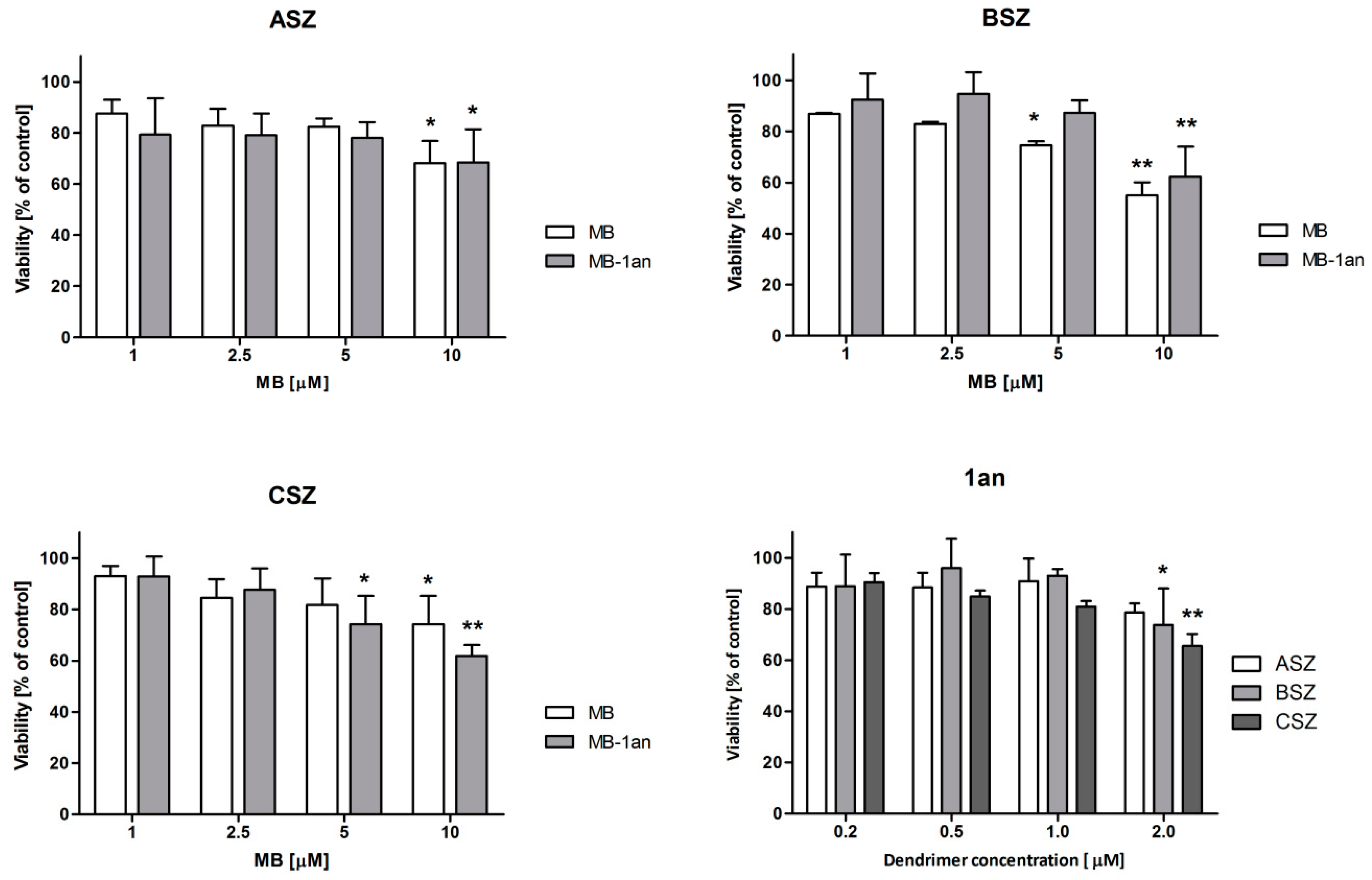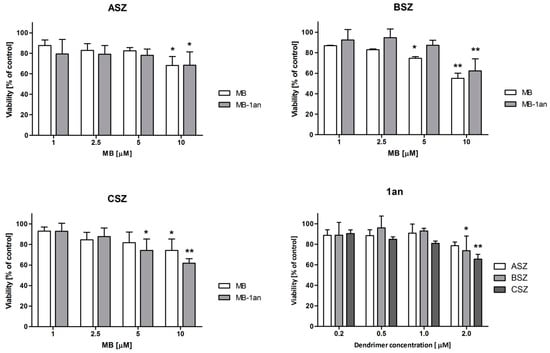 Viability of ASZ, BSZ, and CSZ cell lines after the treatment with MB, MB-1an and 1an without irradiation (dark toxicity). The concentrations of MB varied from 1 to 10 µM, whereas the dendrimer concentration used ranged from 0.2 to 2.0 µM. * p < 0.05, ** p < 0.01.