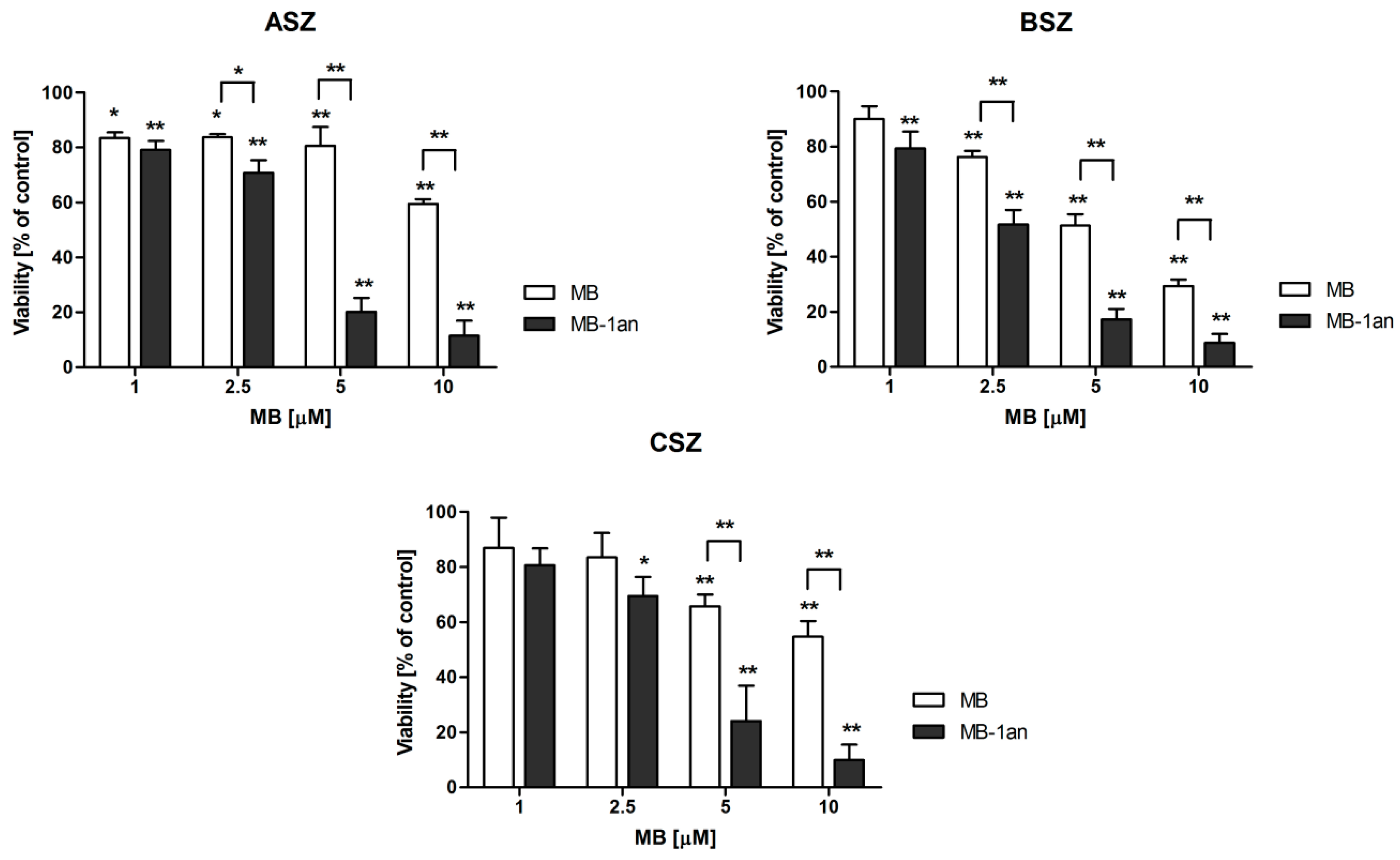 Viability of ASZ, BSZ and CSZ cell lines after the treatment with different concentrations of MB and MB-1an after the 30 min irradiation. The light source was a Q.Light Pro Unit (Q.Products AG, Rorschach, Switzerland) lamp. * p < 0.05, ** p < 0.001.