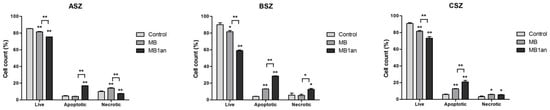 The percentage of live, apoptotic and necrotic cells in ASZ, BSZ, and CSZ cell lines after the irradiation with MB and MB-1an. * p < 0.05, ** p < 0.001.