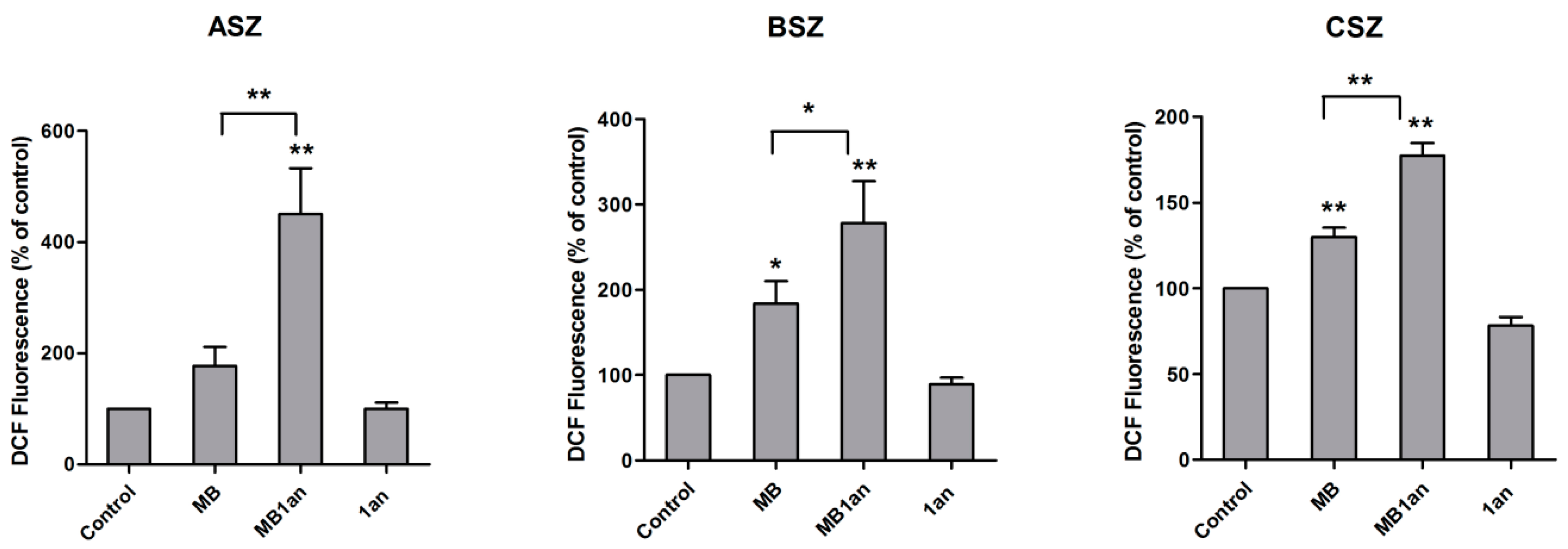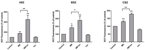 Reactive oxygen species production in ASZ, BSZ, and CSZ cell lines upon irradiation and incubation with MB, MB-1an and 1an presented as DCF fluorescence (% of control). The concentration of MB was 5 µM and the 1an concentration was 1 µM. * p < 0.05, ** p < 0.001.