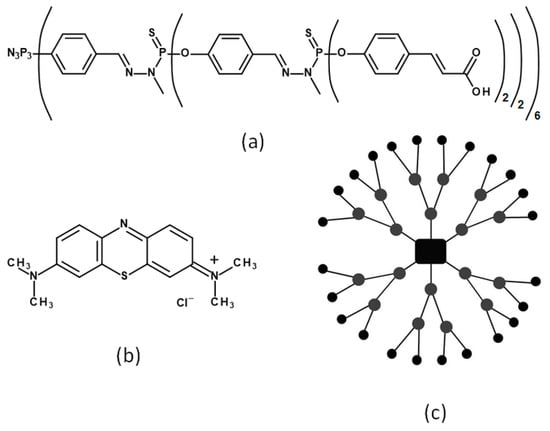 The structures of the compounds used in this study—(a) linear structure of anionic phosphorus dendrimer 1an; (b) methylene blue; (c) schematic representation of the second generation anionic dendrimer structure.
