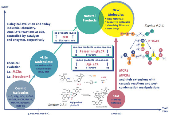 The prominent role of Multi-Component Reactions (MCRs) in the chemical evolution of the range of cosmic molecules (Figure 2) to the molecules of life, such as amino acids and nucleobases, became clear as the selecting agents, the enzymes, were not yet available at that time. Biological evolution over billions of years consequently selected the pathway of the enzyme-controlled, highly selective two-component reactions. The domain of chemical synthesis that expanded exponentially over the past 200 years retained this scheme even though, since the middle of the 19th century, extremely important MCRs such as the Strecker and Hantzsch dihydropyridine syntheses, and the Biginelli reactions represented a yet small, but profoundly important part of the wealth of chemical reactions. Only the isocyanide-based Passerini and Ugi reactions (IMCRs) in the 20th century [31] gave access to a versatile and broad range of prospective syntheses. MCR chemistry has seen a very fast upswing (over 500 reviews) since the turn of the millennium, while the number of new MCRs and their application is increasing steadily, demonstrated in some reviews [32,33,34,35,36,37,38,39,40,41].