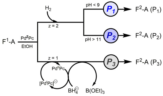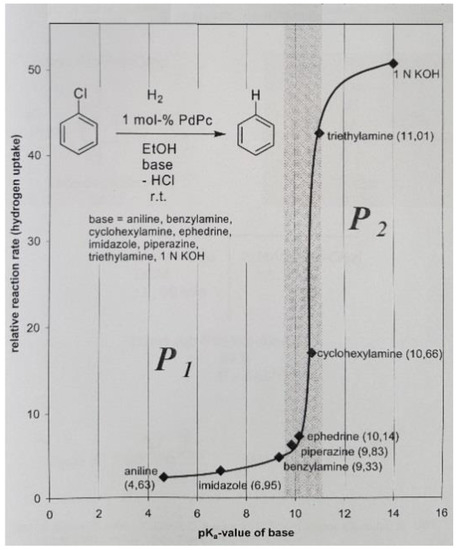 In order to determine the capabilities of the vitamin B12-related CoIIPc and analogous metal-phthalocyanines (MPc), the reactive and the reductive properties of MPc in particular were researched with the metals M = VO, Mn, Fe, Co and Pd as catalysts using the reduction agents hydrogen and sodium borohydride [19,20]. The pronounced poisoning resistance of CoIIPc against strong catalyst poisons such as I−, CN− or R-S− was impressive.