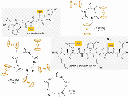 Peptide synthesis is often faced with the problem of difficult or practical insolubility of sequences in solvents if corresponding conformations of the sequences can be taken. Preventing this requires reversibly masking the peptide bonds. This is most favorably achieved using the ferrocenylmethyl (Fem) residue [22], which can simply be introduced via the easily accessible ferrocenaldehyde on the amino function of the respective amino acid in a reductive alkylation reaction with H2 at PdIIPc and removed with trifluoroacetic acid in dichloromethane. Various human-β-endorphin sequences [23], Leu-enkephalin and hexaglycine [24] and the cyclopeptides cyclo-triglycine and cyclo-pentaglycine [25] could be produced with this method under mild conditions with far better yields than previously possible (Figure 5). Also of interest is the further useful application of PdIIPc in selective reductive alkylation. The Fem residue transfers modified properties here to the peptides: