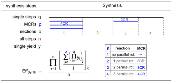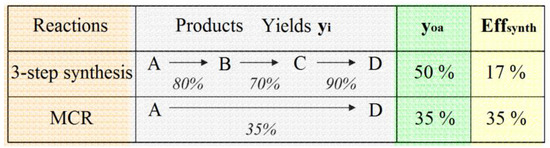 Syntheses of a product D with various numbers of steps can vary greatly in efficiency, as shown in Scheme 8. Even when the yield of the MCR is only moderate, its synthesis efficiency still is twice as high as that of a 3-step synthesis with its good yield. The synthesis efficiency tool helps to assess and forecast synthesis schemes. Section 10 concerns the development of an algorithm relating to the efficiency of MCRs with regards to parallel reactions.