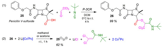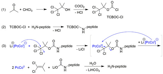 The lithium salt of Cobalt(I)-phthalocyanin, Li[CoIPc] 1b (Section 3), was the selected reagent which met all conditions: fast reaction at room temperature (RT) in neutral environments, no reaction with other functional groups (except for the nitro group), high product yields and complete regeneration capability of the fully stable reagent. The cleavage of the protective groups can also be carried out catalytically on CoIIPc 1 with NaBH4 [12]. As an optimal protective group, the acid and base-stable 2,2,2-trichloro-tert-butyloxycarbonyl-residue (TCBOC) was created, which is introduced via its stable chloride TCBOC-Cl and can be cleaved off in just 1 min using 1a (Scheme 1) [10]. Due to the extremely mild conditions, the method has been successfully used for the semi-synthesis of unstable β-lactam antibiotics, such as penicillin and cephalosporin derivatives (Figure 3) [13,14,15,16] [C].