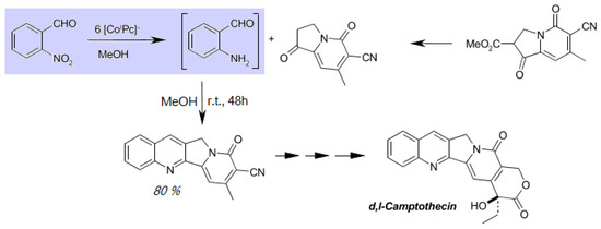 The reagent Li[CoIPc] stands out due to its almost unique selectivity: apart from the reductive fragmentation, practically only the nitro group is reduced to the primary amine function [17,18]. All other normal functional groups remain intact, which makes 1a particularly suitable for the in-situ preparation of aromatic o-amino-aldehydes in the Friedländer synthesis reaction. A significant improvement in the total synthesis of the frequently used anticancer drug camptothecin could be achieved (Scheme 2), whereby the yield of step 6 was increased from 20% to 62% [18] and up to 80%.