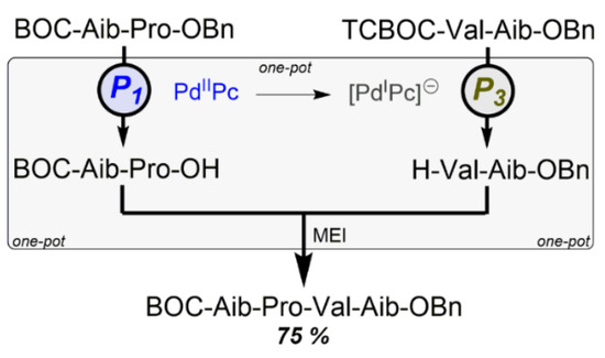 The starting substance was the protected dipeptide BOC-Aib-Pro-OBz. After P1, the benzyl residue is selectively cleaved off with H2 at 2. After adding of TCBOC-Val-Aib-OBn the TCBOC residue can be removed with inverse selectivity after P3 at 2a through the addition of NaBH4. This leaves the benzyl residue intact. The final coupling using morpholinoethyl isocyanide delivers the protected tetrapeptide with a yield of 75% via three steps in one reactor (Scheme 4). Synthesis efficiency (for this item see Section 8) is EffSynth = 75%, whereas that of the three single reactions with very good yields in [21] is EffSynth = 23% only. The 2/H2/EtOH system is air-stable and the catalyst PdIIPc can be quantitatively recovered and re-used without further treatment.