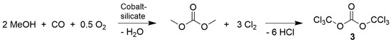 Synthesis of 3 was rather simple: radical chlorination of dimethyl carbonate (DMC, Scheme 5). The up-scaling of the reaction to a 20-L flask resulted in a yield per batch of approx. 20 kg (99%) triphosgene with a melting point of 80 °C [F]. DMC is a million-ton product that is industrially produced using methanol, CO and O2 (Scheme 5). Compound 3 could replace all actual reactions of phosgene [27,28,29], was therefore named as triphosgene and as a crystalline solid it is significantly safer to handle than the gaseous phosgene 4, as can be seen in Table 3.