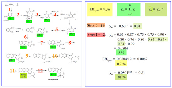 The synthesis efficiency EffSynth (Scheme 7) follows from the overall yield yoa and number of steps n of a synthesis, where the overall product yield equals the product of all the individual yields per step. A value which better reflects the yield is the average step yield yav. Scheme 7 represents the data for the camptothecin synthesis in Section 5.1 Scheme 2 [18] on the basis of these evaluation criteria.