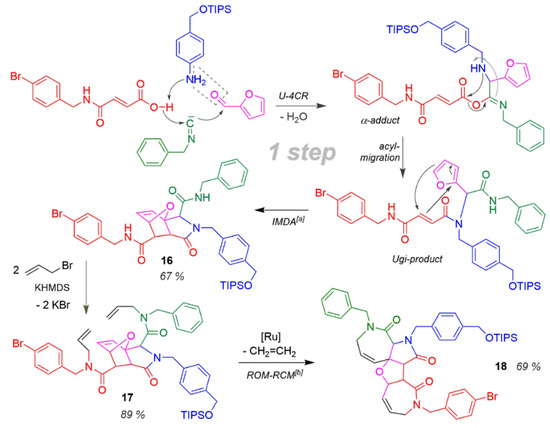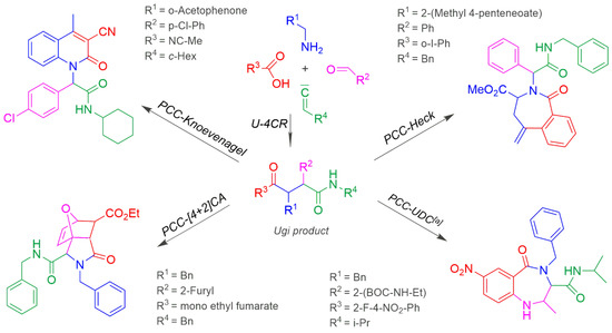 The efficiency of MCRs can be increased by extensions without adding additional reaction partners, because functional groups are present in the STM that react in Domino-reactions with the newly created functional groups in the MCR as post-condensation modification (PCM) and post-condensation cyclisation (PCC) [87,112,113,114,115,116,117,118,119,120,121,122]. Scheme 10 shows examples of several Tandem-U-4CR/Diels-Alder, Knoevenagel, Heck or UDC reactions as PCCs [87].