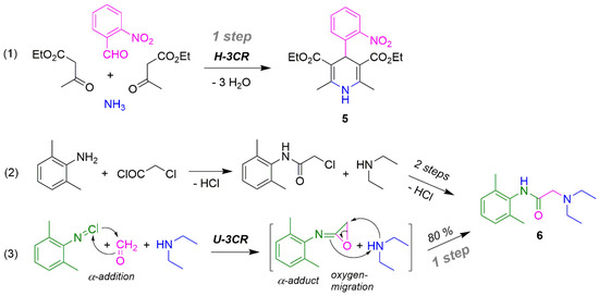 - Mironov, M.A. Design of multi-component reactions: From libraries of compounds to libraries of reactions. QSAR Comb. Sci. 2006, 25, 423–431. [Google Scholar] [CrossRef]