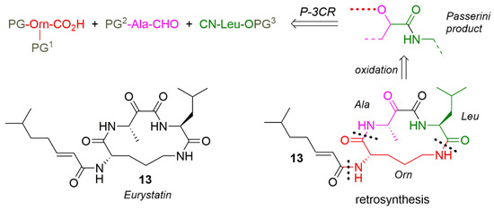 - Owens, T.D.; Araldi, G.-L.; Nutt, R.F.; Semple, J.E. Concise total synthesis of the prolyl endopeptidase inhibitor eurystatin A via a noval Passerini raction-deprotection-acyl-migration strategy. Tetrahedron Lett. 2001, 42, 6271–6274. [Google Scholar] [CrossRef]