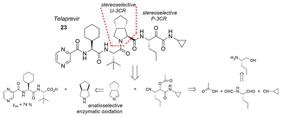 - Znabet, A.; Polak, M.M.; Janssen, E.; de Kanter, F.J.J.; Turner, N.J.; Orru, R.V.A.; Ruijter, E. A highly efficient synthesis of telaprevir by strategic use of biocatalysis and multicomponent reactions. Chem. Commun. 2010, 46, 7918–7920. [Google Scholar] [CrossRef] [PubMed]