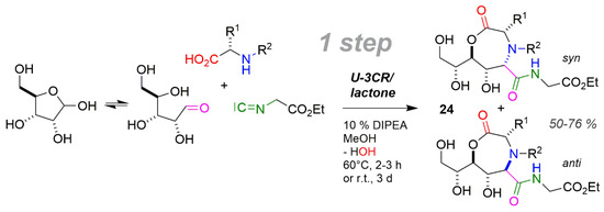 - Voigt, B.; Linke, M.; Rainer Mahrwald, R. Multicomponent Cascade Reactions of Unprotected Carbohydrates and Amino Acids. Org. Lett. 2015, 17, 2606–2609. [Google Scholar] [CrossRef] [PubMed]
