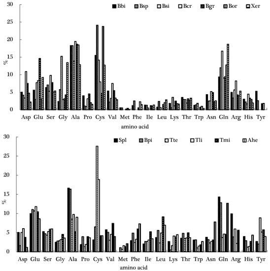 Amino acid profiles of the mushroom species. Abbreviations: Bbi, B. bicolor, Bsp, B. speciosus, Bsi, B. Sinicus, Bcr, B. craspedius, Bgr, B. griseus, Bor, B. ornatipes, Xer, Xerocomus, Spl, S. placidus, Bpi, B. pinetorus, Tte, T. terreum, Tli, T. lividipileata, Tmi, T. microcarpus, Ahe, A. hemibapha. Asp, aspartic acid, Glu, glutamic acid, Ser, serine, Gly, glycine, Ala, alanine, Pro, proline, Cys, cysteine, Val, valine, Met, methionine, Phe, phenylalanine, Ile, isoleucine, Leu, leucine, Lys, lysine, His, histidine, Thr, threonine, Asn, asparagines, Gln, glutamine, Arg, arginine, Tyr, tyrosine, Trp, tryptophan.