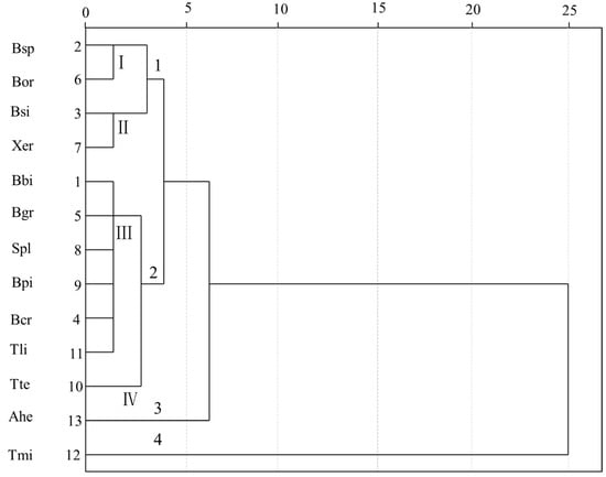 Cluster analysis undertaken with all the analytical parameters revealed four different clusters (Figure 3). Cluster 1 and 2 included four and seven mushroom species, respectively, while, cluster 3 and 4 contained only one species each, Ahe and Tmi, respectively. As shown in Table 2 and Figure 3, EAA played an important role in the clusters of the 13 mushroom species. Tmi in cluster 4 showed the highest content of EAA among the 13 mushrooms, and Ahe in cluster 3 was significantly higher than in the others. Cluster 1 was formed of four species and the range of EAA contents was 4234.3–5650.1 mg/100 g. Cluster 1 was further divided into two sub-clusters which were noted I and II. The EEA contents of Bsp and Bor in sub-cluster I showed no significant difference, while Bsi was similar to Xer in sub-cluster II. Cluster 2 produced two sub-clusters, III and IV, which included six and one mushroom, respectively. Tte in sub-cluster IV was different from the other six mushroom species in sub-cluster III, due to the high content of Tyr and low content of Gln in the Tte sample, except for the difference in EAA content. This was in accordance with the PCA analysis (Table 2).
