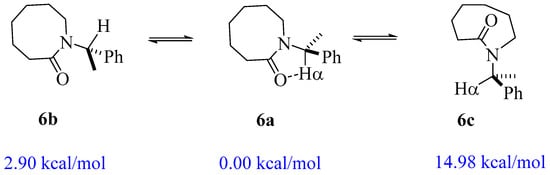 Similar to previous work [], two minima were observed for lactams 1–6: the closed structure a and the open structure b (Figure 2). These geometries were characterized by the dihedral angle Φ given by the H(1), C(2), N(3), and C(4) atoms. The closed geometry a has values Φ near to 0.0°, suggesting C-Hα···O bond formation, whereas in the open conformation b, the Φ angle is near to 180°, indicating the lack of Hα···O contact. Subsequently, the geometry of lactams depicted in Figure 1 were optimized in both closed and open forms, and their energy differences were determined (see Supplementary File: Tables S1–S12). The relative energies (ΔE = Eclosed − Eopen) were corrected by zero point energies, and the results are shown in Table 1.