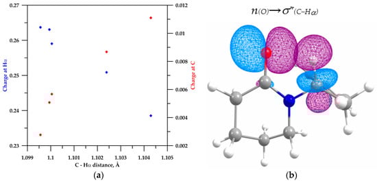 (a) Correlation of population of charges for H and C in the C−Hα bond with the C−Hα distance (charge of H in blue and for C in red); (b) NBO plots illustrate the overlap of the n(o) orbital and the σ*(C−Hα) orbital in the conformer 4a.