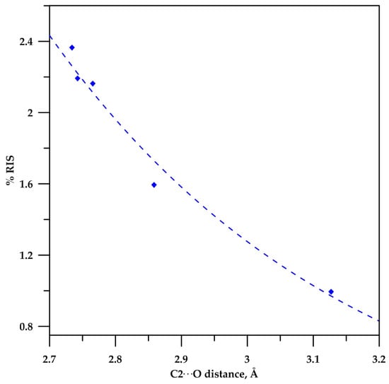 Correlation of %RIS for C−H bond with C2···O distance donor–acceptor. %RIS = 813.64Exp(−2.153*distance), R2 = 0.9806.