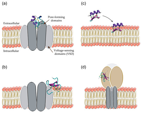 - Deplazes, E.; Henriques, S.T.; Smith, J.J.; King, G.F.; Mark, A.E.; Craik, D.J.; Schroeder, C. Membrane-binding properties of gating-modifier and pore-blocking toxins: Membrane interaction is not a prerequisite for modification of channel gating. BBA Biomembr. 2016, 1858, 872–882. [Google Scholar] [CrossRef] [PubMed]