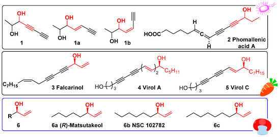 - Negri, R. Polyacetylenes from terrestrial plants and fungi: Recent phytochemical and biological advances. Fitoterapia 2015, 106, 92–109. [Google Scholar] [CrossRef] [PubMed]