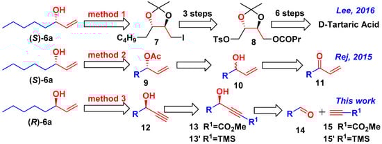 Inspired by potential applications above, great attention has been paid to preparation of compounds 6 with high enantioselectivity and structural diversity [11,12,13,14,15,16,17,18,19]. To take (R)-matsutakeol 6a as an example, in 1987, 6a and its enantiomer were obtained by Helmchen through the asymmetric retro Diels-Alder reaction [11]. In the same year, Takano prepared the (R)-matsutakeol by using the optically active starting material of (R)-epichlorohydrin [12]. In 1988, Kitamura obtained (R)-matsutakeol (21% ee) via kinetic resolution of racemic allylic alcohols [13]. Oppolzer developed an enantioseletive synthesis of (R)-matsutakeol (96% ee) by catalytic asymmetric addition of divinylzinc to hexanal [14]. In 2005, a chiral resolution of racemic matsutakeol was conducted using (S)-(+)-2-methoxy-2-(1-naphthyl) propionic acid (MαNP acid) by Kusuda [15]. In addition, various enzymatic kinetic resolution and enzyme-catalyzed reactions have also been used in preparation of chiral matsutakeol. In 2010, Bisogno developed an efficient oxidoreductase-catalyzed system to obtain (R)-matsutakeol in 86% ee [16]. Recently, Rej prepared (S)-matsutakeol as an important intermediate, by ME-DKR (metal enzyme combined dynamic kinetic resolution) of (±)-oct-1-en-3-ol [17,18]. In 2016, Lee developed a synthetic strategy towards (S)-matsutakeol in 10 steps from inexpensive, natural (2S,3S)-d-tartaric acid with 32% yield [19].