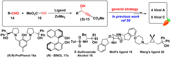 In summary, matsutakeol could be prepared by chiral pool synthesis [19], enzymatic kinetic resolution [17,18], and asymmetric synthesis [14] (Scheme 1). Although, several synthetic routes have been developed, there is still a lack of efficient method for obtaining a highly enantioselective allyl alcohols library in screening for flavors or attractants. Compared to asymmetric synthesis (Scheme 1, method 3), the structural diversity of the reaction products is limited by chiral sources (Scheme 1, method 1) [19], and the effect of enzymatic reaction (Scheme 1, method 2) is constrained by stability and activity of enzymes [17,18]. By retro-synthetic analysis, the chiral olefinic alcohol 6 could be formed from propargyl alcohol 12, and chiral propargyl alcohol 12 can be synthesized from the corresponding methyl propiolate 13 (Scheme 1, method 3). Highly enantioselective methyl propiolate (S)-13 is obtained by Zn-catalyzed asymmetric addition of terminal alkynes 15 to various aldehydes 14. This reaction has been widely studied (Scheme 2) [20,21,22,23,24,25,26,27,28,29,30,31,32,33,34,35,36,37,38,39,40,41,42,43,44,45,46,47,48,49,50], in which numerous chiral ligands are applied, such as (R,R)-ProPhenol 16a [24,39], (R)-BINOL 17a, and its derivatives [28,30], β-Sulfonamide Alcohol 18 [31,32], Wolf’s ligand 19 [41], and Wang’s ligand 20 (our previous group research) [33]. Among the numerous catalysts, (R,R)-ProPhenol 16a and (R)-BINOL 17a are readily available and well-established [20,21,22,23,24,25,26,27,28,29,30,31,32,33,34,35,36,37,38,39,40,41,42,43,44,45,46,47,48,49,50].