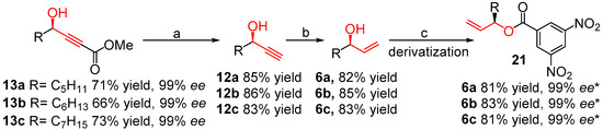 Herein, we attempted to synthesize the above natural products 6a–c on gram scale, by employing the (S)-BINOL 17b as the catalyst. As shown in Scheme 4, (S)-BINOL efficiently catalyzed the asymmetric addition of trimethylsilylacetylene with the corresponding aliphatic aldehydes 14a–c, affording compounds 13a’–c’ in moderate yields (71%–72%) and enantioselectivities (80%–82% ee), slightly lower than those of compounds 13a–c. K2CO3-promoted deprotection of trimethyl group of compounds 13a’–c’ under mild conditions gave compounds 12a–c in good yields (87%–89%) [52]. Following the same procedures as shown in Scheme 3, compounds 6a–c were obtained in moderate yields (81%–83%) and nearly without loss of enantioselectivities (79%–82% ee, the ee values were measured by HPLC after derived by 3,5-dinitrobenzoyl chloride). The enantiomeric purity of 21a–c could be improved to over 99% ee by slow recrystallization from diethylether/n-hexane (1:5) at a low temperature. Subsequently, the esters 21a–c could be quantitatively hydrolyzed to the corresponding chiral alcohols 6a–c followed in our previous group research [22].