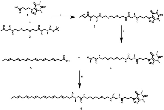 Synthesis of the caffeine-DHA hybrid structure (6). (i) Synthesis of tert-butyl (19-(1,3-dimethyl-2,6-dioxo-2,3-dihydro-1H-purin-7(6H)-yl)-15-methyl-2,13,16-trioxo-6,9-dioxa-3,12,15-triazanonadecyl)(methyl)carbamate (3); (ii) Synthesis of 4-(1,3-dimethyl-2,6-dioxo-2,3-dihydro-1H-purin-7(6H)-yl)-N-(4,15-dioxo-8,11-dioxa-2,5,14-triazahexadecan-16-yl)-N-methylbutanamide (4); (iii) Synthesis of (4E,7E,10E,13E,16E,19E)-N-(19-(1,3-dimethyl-2,6-dioxo-2,3-dihydro-1H-purin-7(6H)-yl)-15-methyl-2,13,16-trioxo-6,9-dioxa-3,12,15-triazanonadecyl)-N-methyldo-cosa-4,7,10,13,16,19-hexaenamide (6).