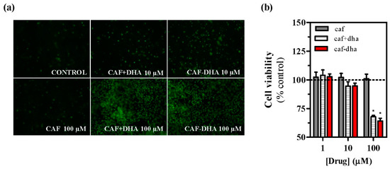 Evaluation of caffeine-DHA toxicity. (a) Representative images of A2AR-expressing cells incubated with either HBSS (control) or the drug (caffeine, caffeine plus DHA or caffeine-DHA) and subsequently treated with propidium iodide (10 µM). The drug and concentration are indicated in each image; (b) Fluorescence levels obtained in A2AR-transfected cells treated with propidium iodide (10 µM) after drug (caffeine, caffeine plus DHA or caffeine-DHA) incubation. Data represent the mean ± s.e.m. of four independent experiments. Basal viability levels (control) were set as 100%. Asterisks indicate significant differences between drug treatments for each concentration (* p < 0.05, one-way ANOVA followed by Bonferroni’s post hoc test).