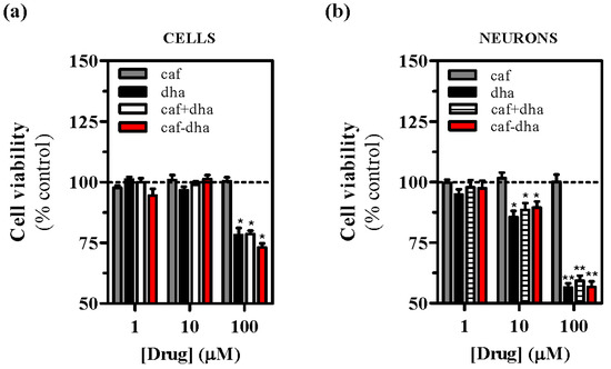 The safety profile of the novel drug was assessed by measuring cell viability after treatment, using the well-characterized agent propidium iodide, which is not able to insert into the DNA of intact living cells [28]. A2AR-expressing cells incubated with caffeine-DHA at concentrations higher than 10 µM showed high mortality (Figure 4a,b). While caffeine did not induce toxicity at any concentration, caffeine-DHA had a dramatic effect on cell viability at higher concentrations (Figure 4a,b). Interestingly, the co-administration of caffeine and DHA also produced cell toxicity, suggesting that DHA could be responsible for the observed cell death. A possible explanation for this toxic effect could be that high concentrations of DHA destabilize the plasma membrane, an event that would not occur physiologically as the tissue would buffer any lipid excess. This concentration-dependent toxicity of caffeine-DHA was further confirmed by MTT viability assays and in neuronal cell cultures. Again, high concentrations (100 µM) of caffeine-DHA induced cell death, as did the administration of DHA alone or with caffeine (Figure 5a). Furthermore, primary striatal cultures were more susceptible to toxicity than HEK293T cells, since cell survival of the primary cultures was significantly affected even at intermediate concentrations (10 µM) (Figure 5b). Thus, caffeine-DHA exhibited adverse effects when used at high concentrations, but was effective and safer at low concentrations. Although adverse effects are a major issue in drug development, we showed that caffeine-DHA can be used safely, albeit in a small range of concentrations. However, dosing in whole organisms is still a challenge and requires a benefit/risk profile. In fact, DHA has been shown to be safe in a number of studies and is a dietary supplement for a number of pathologies, including PD [21]. Hence, it is reasonable to continue developing caffeine-DHA in both pre-clinical and clinical studies.