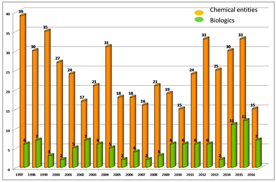 The pharmaceutical sector is, without a doubt, the most intriguing industrial activity. At a glance, it is associated with heavy investments, strong regulations, and a low number of outputs in terms of new products [2]. During the last 20 years (1997–2016), the U.S. Food and Drug Administration (FDA), which is probably the most important regulatory agency, followed by the European Medicines Agency (EMA), has approved a total of 595 new entities [3,4]. Of these, 491 were new chemical entities (NCEs) and 103 biologics, the latter accounting for 17% of the total (Figure 1). The pharmaceutical industry produces approximately 30 new entities yearly—25 being NCEs and five biologicals.