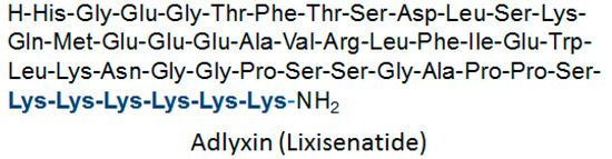 Other TIDES (oligo- pep-TIDES) approved this year include Adlyxin, a 44-amino acid peptide antidiabetic (Figure 3), with a molecular weight of 4858 that belongs to the family of glucagon-like peptide-1 (GLP-1) agonist. Specifically, Adlyxin is derived from exendin-4, where the Pro at the C-terminal has been removed and a linker of Lys6 (Figure 3, highlighted Blue) has been added instead [6].